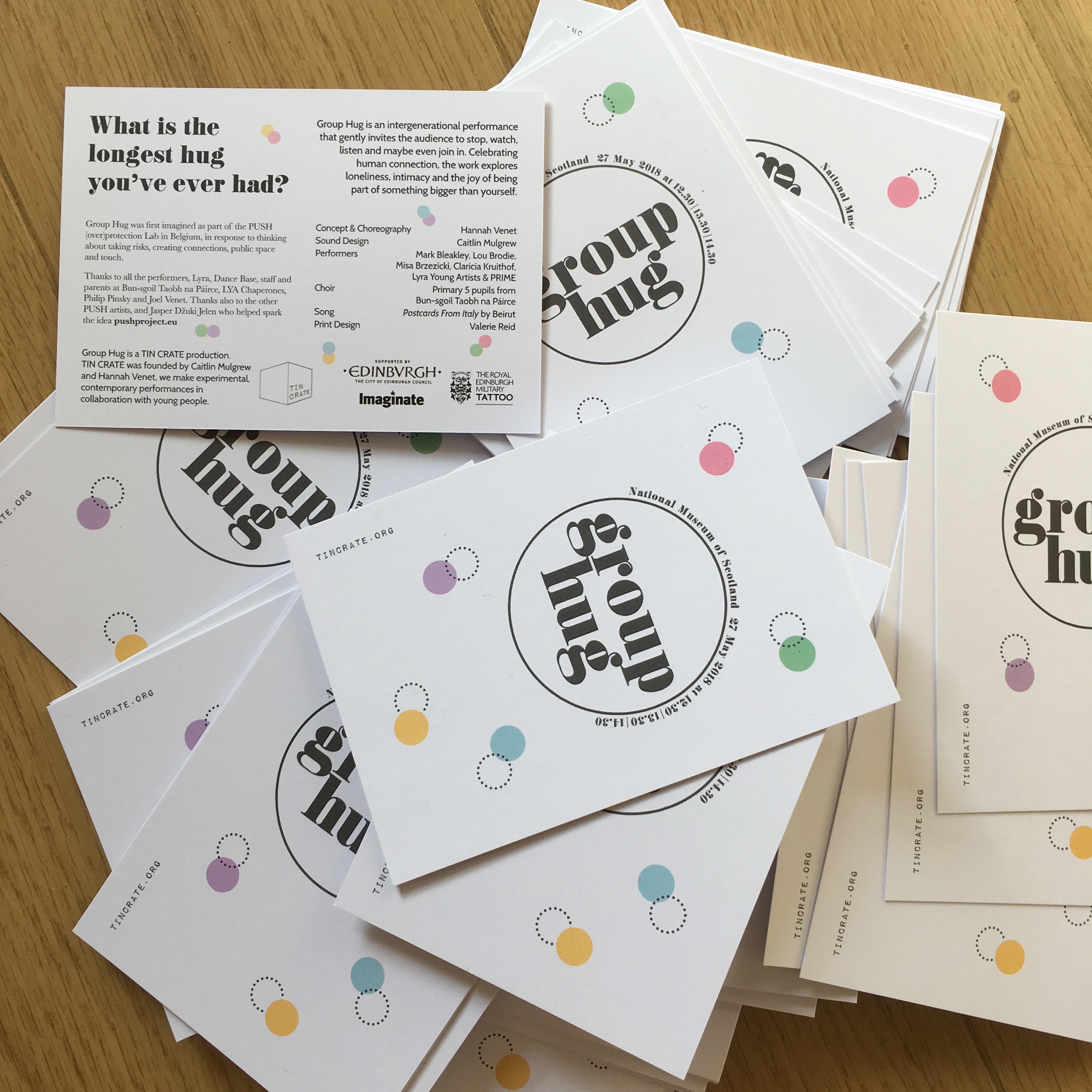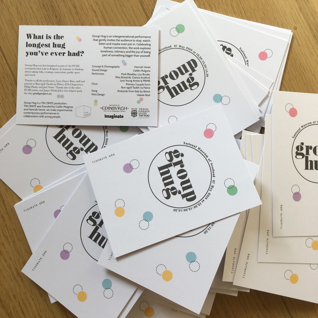 Project identity, postcard and instruction card designs for Tin Crate‘s group hug performance at the National Museum of Scotland, May 2018.
